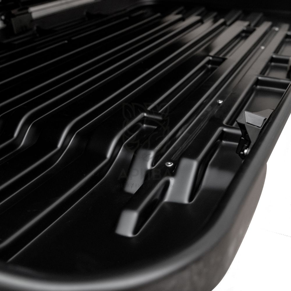 Покрытие крышки матовое, открывание с двух сторон, фиксация к поперечинам производится скобами-хомутами. Нижний поддон имеет продольные металлические усиления из оцинкованного металла. Три вида цвета крышки - белая, черная, серая. В комплекте каждого автобокса ремни для фиксации груза внутри автобокса.