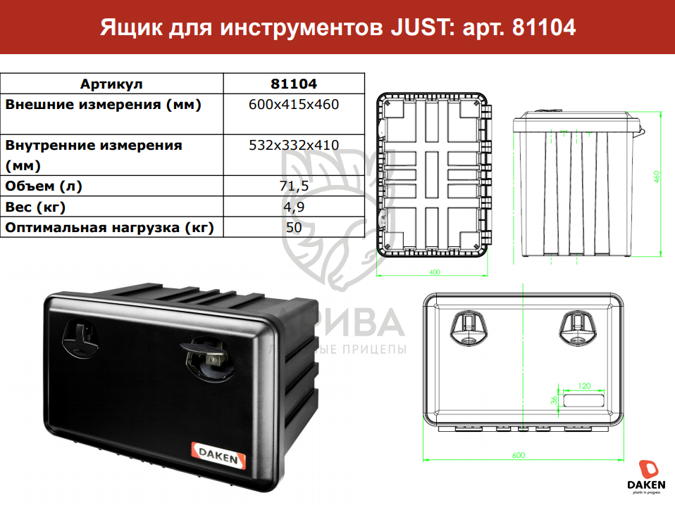 Купить Инструментальный ящик, Daken JUST, 600х415х460мм, 71,5L в городах Казань, Уфа, Ижевск, Набережные Челны, Чебоксары по низким ценам. Большой выбор недорогих прицепов, фаркопов, автобоксов, запчастей для легковых прицепов. Быстрая доставка. Оригинальные товары, гарантия, рассрочка, распродажи, скидки и акции. Огромный ассортимент. Реальные отзывы покупателей