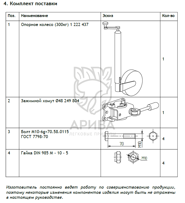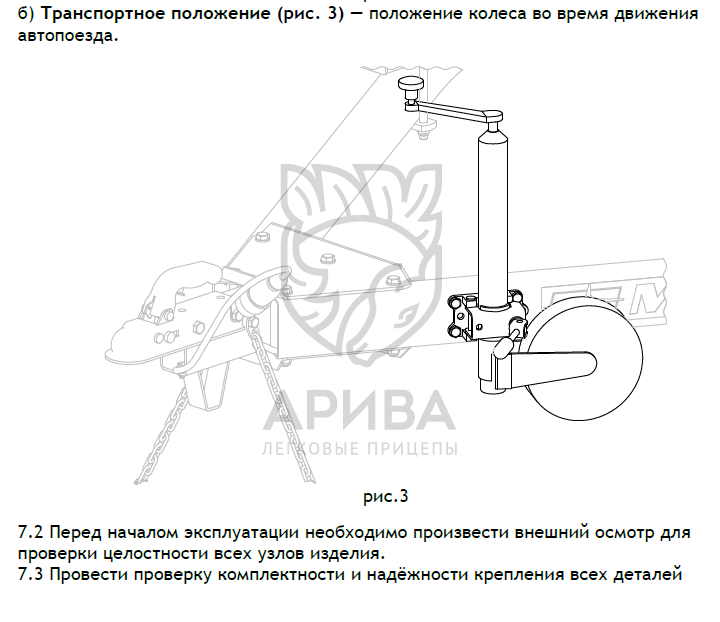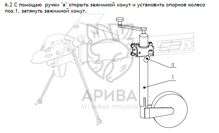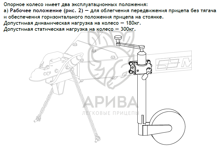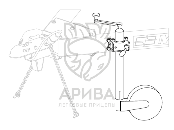 Оцинкованное опорное колесо (Ø48) с упорным подшипником рукоятки, в комплекте с элементами крепежа, для установки на прицепы МЗСА с полной массой до 750 кг (ширина трубы дышла 50 мм). Регулируется по высоте, обеспечивает горизонтальное положение прицепа и облегчает его перемещение без тягача.