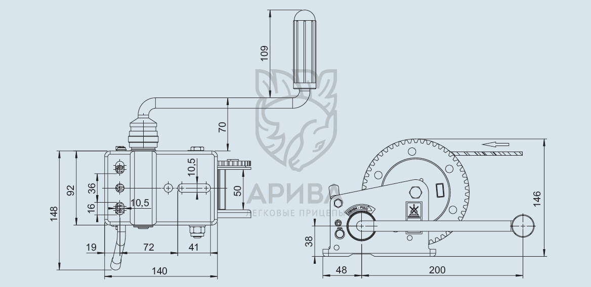 • Ход троса за один оборот ручки - 37-90 мм