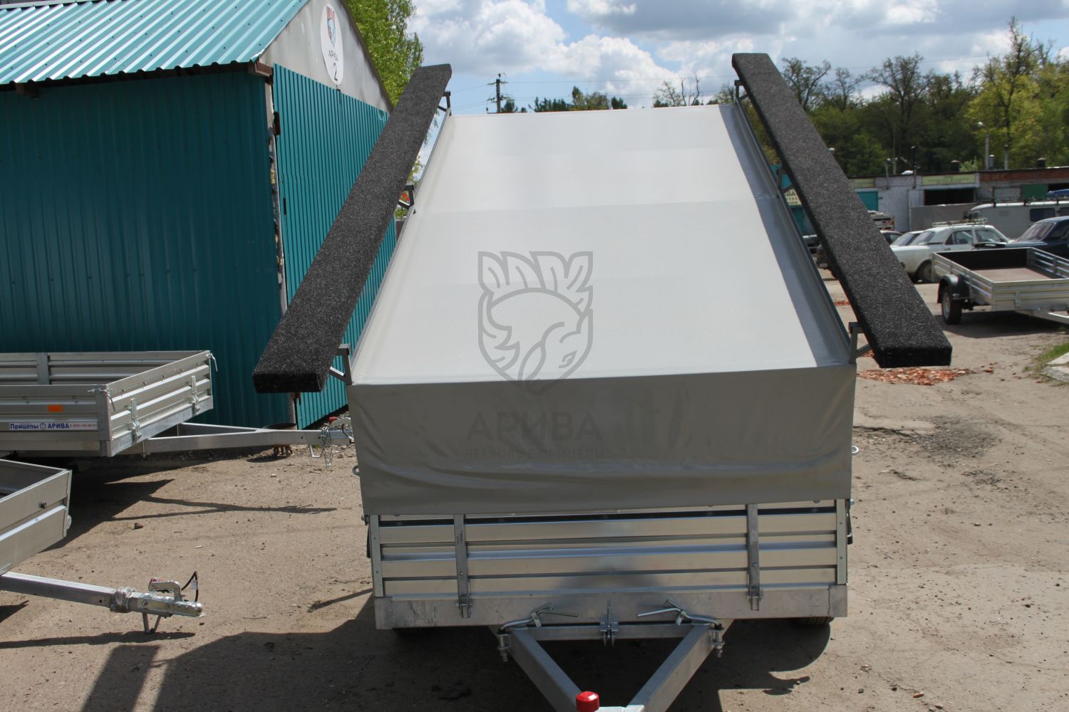 Под лодкой в кузове прицепа можно перевозить необходимый груз. Сверху на кузове установлен каркас и ЕВРО тент. Каркас тента и ЕВРО тент откидываются на двух петлях и удерживаются в откинутом положении с помощью двух газовых упоров. Высота от пола прицепа до потолка 0,6 м.Строение стапеля и крышки