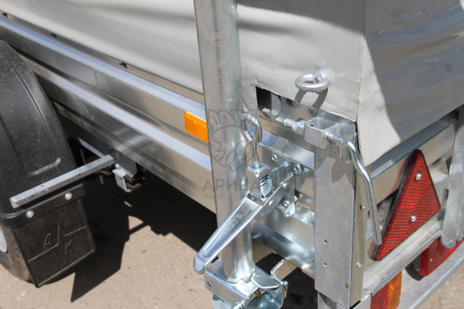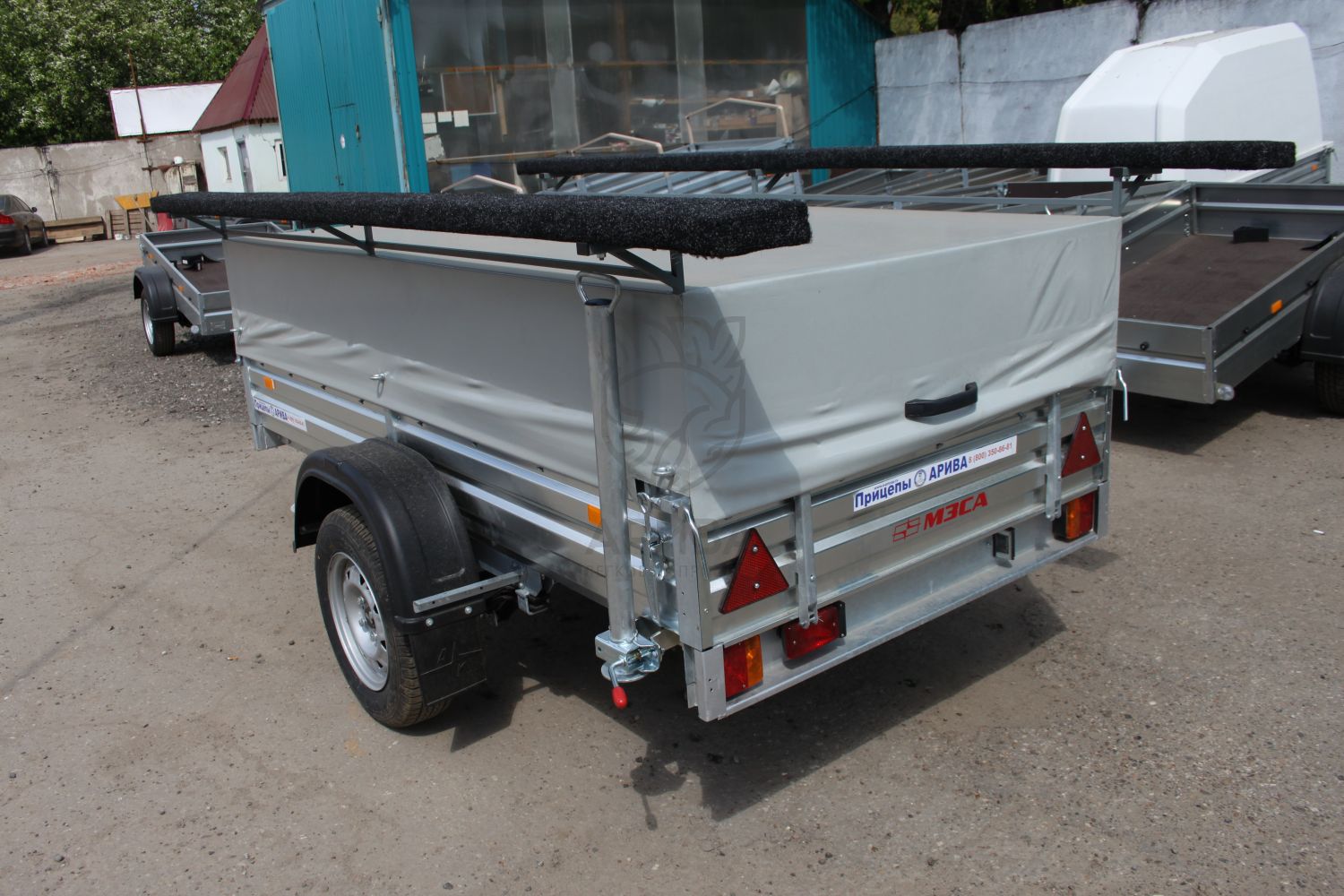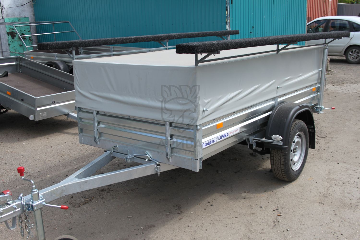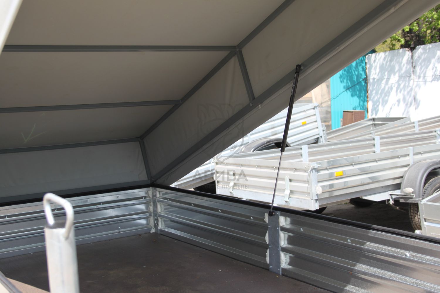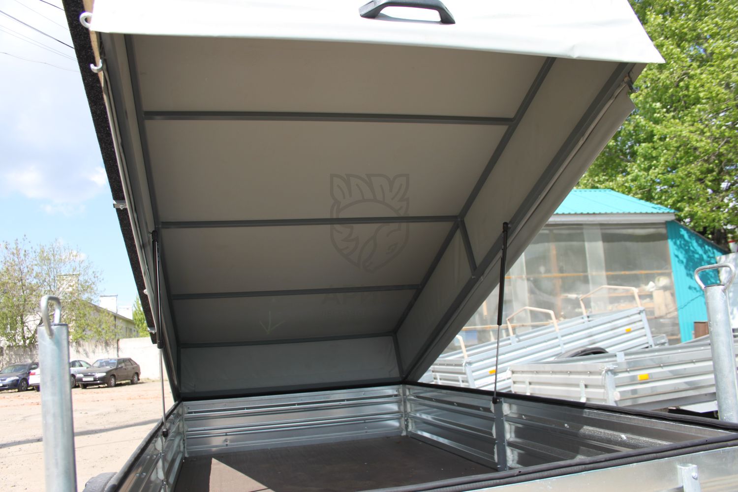 Под лодкой в кузове прицепа можно перевозить необходимый груз. Сверху на кузове установлен каркас и ЕВРО тент. Каркас тента и ЕВРО тент откидываются на двух петлях и удерживаются в откинутом положении с помощью двух газовых упоров. Высота от пола прицепа до потолка 0,6 м.Строение стапеля и крышки