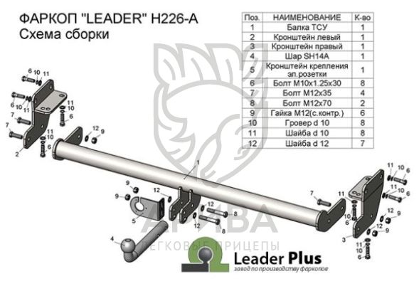 Фаркоп «Leader» легко устанавливается на штатные места автомобиля, предусмотренные заводом-изготовителем,без сверления дополнительных отверстий в кузове. Снятия и подрезки бампера не требуется.