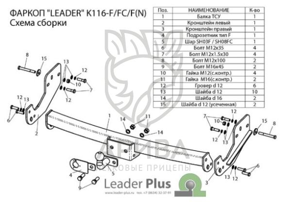 Фаркоп «Leader» легко устанавливается на штатные места автомобиля, предусмотренные заводом-изготовителем,без сверления дополнительных отверстий в кузове. Снятия и подрезки бампера не требуется.