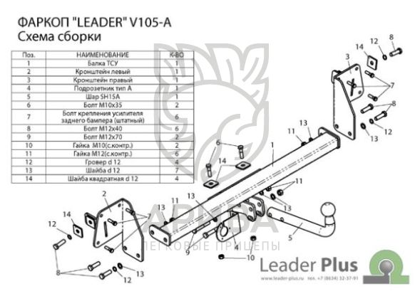 Фаркоп «LEADER» укомплектован всем необходимым для установки на автомобиль ( семиконтактной розеткой , монтажными проводами,крепежом, защитным колпачком и паспортом) и упакован в термоусадочную пленку. Для окраски фаркопа «LEADER» используется полимернопорошковая краска с повышенной износоустойчивостью.