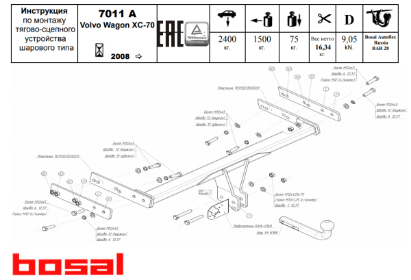 Фаркоп Вольво (Volvo) XC60 2012-2017-, (Volvo) XC70 2007-2016 7011-A