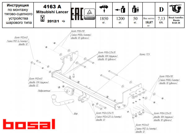 Фаркоп Митсубиси (Mitsubishi) Lancer 2012- (двигатель 1.6 л) 4163-A