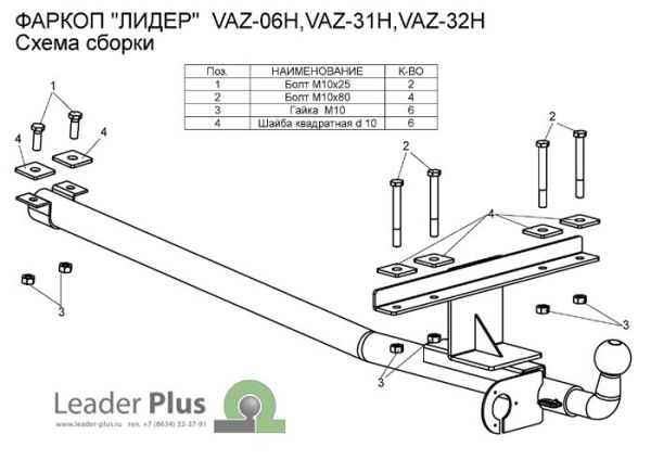 Фаркоп ВАЗ 2121 Нива (профильная труба) 1977-2014. Без выреза бампера. Нагрузки: 750/75 кг, со сварным шаром, требуется просверлить 4 отверстия T-VAZ-34H