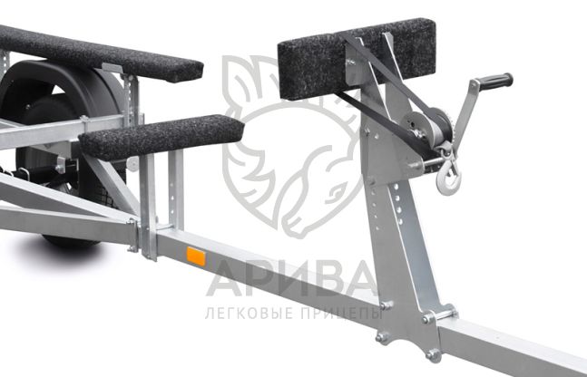 ● Передвижной носовой упор оборудован лебёдкой, имеет регулируемую высоту, угол наклона. Он может быть отрегулирован и установлен в наиболее удобном положении для модели перевозимого судна. Лебёдка облегчает погрузку судна на прицеп и страхует его при спуске на воду.