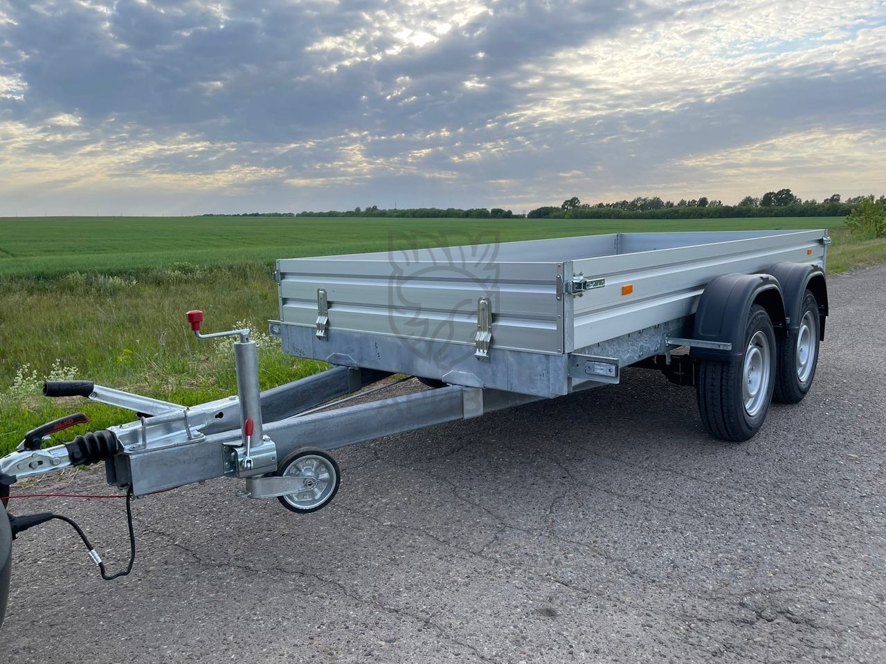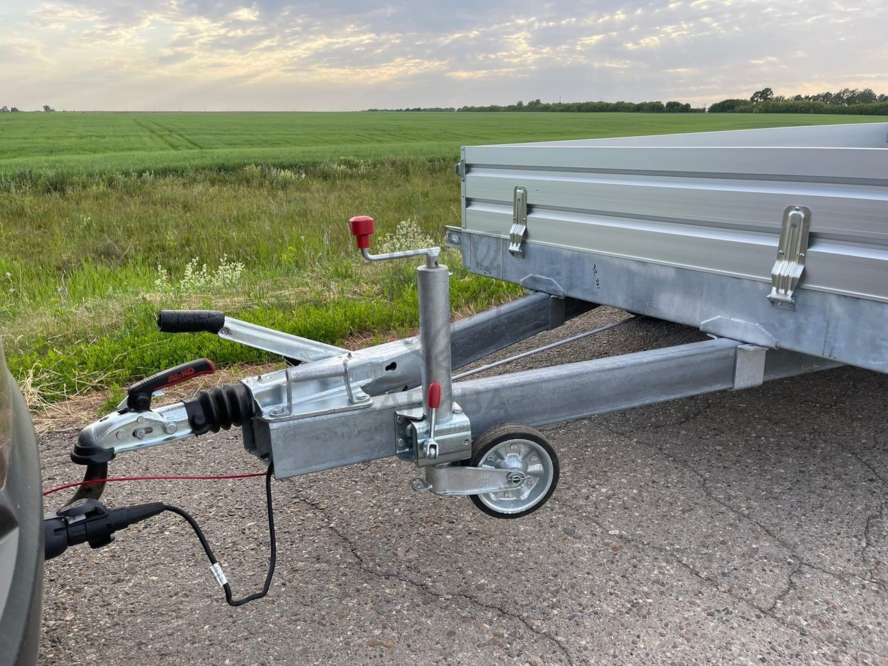 ● Оцинкованное опорное колесо с упорным подшипником рукоятки. Регулируется по высоте, обеспечивает горизонтальное положение прицепа и облегчает его передвижения без тягача